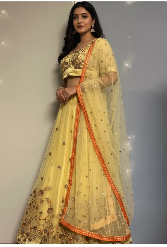 Embrace the warmth of celebrations in this beautiful pale yellow lehenga. Detailed gold and bronze floral embroidery gracefully adorns the border, while all-over sequins catch the light. The contrasting orange border on the net dupatta adds a lively pop of color. An ideal choice for daytime events like Haldi and Mehendi.